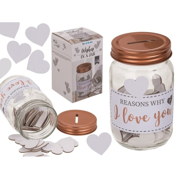 Dóza s nápisem Důvody, proč Tě miluji, je naplněna 50 prázdnými papírovými srdíčky, na která můžete napsat vlastní
