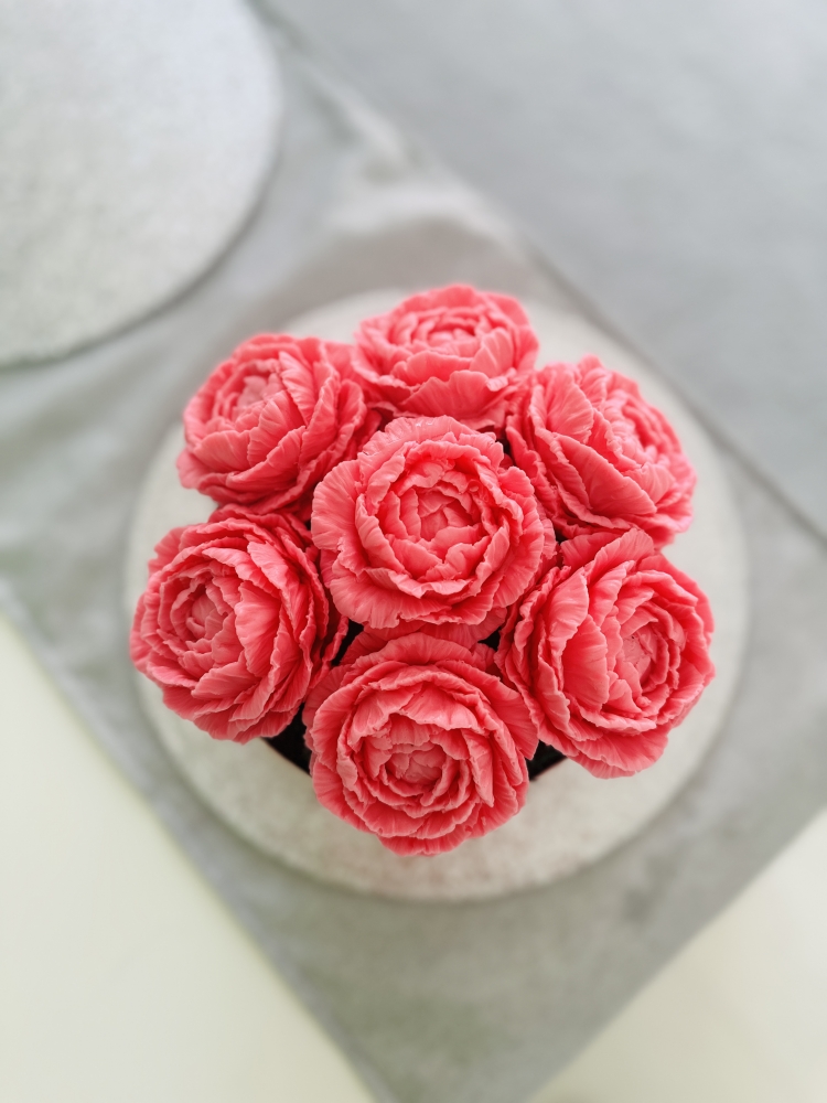 Mýdlová kytice z květů pivoněk v růžových odstínech s ovocno - květinovou vůní (složení vůně : jasmín, hyacint, kosatec, ambra, cedr, pižmo). Ručně odlévané květy z mýdlové hmoty s bambuckým máslem. Box obsahuje 7 květů pivoněk, umělý eukalyptus a umělý mech.
