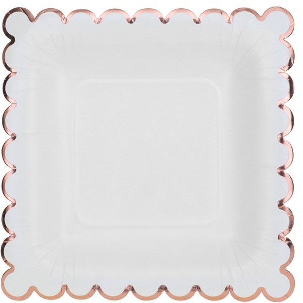 Bílé papírové talířky čtvercového tvaru s vroubkovaným lemem v barvě rose gold.