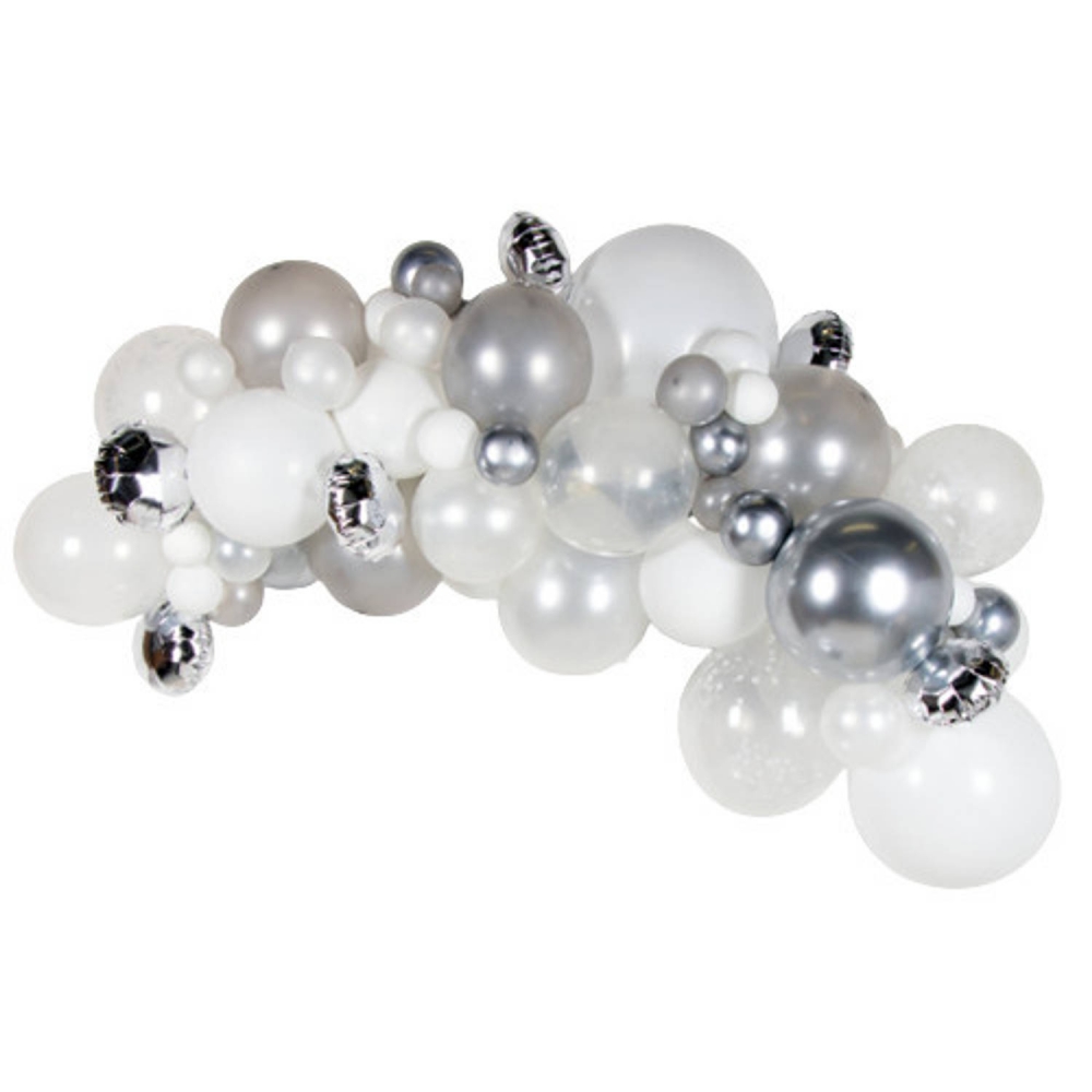 Sada balónků pro sestavu krásné balónkové girlandy v elegantní barevné kombinaci stříbrné a bílé, která vám nádherně ozdobí jakoukoliv párty, svatbu či narozeninovou oslavu.
