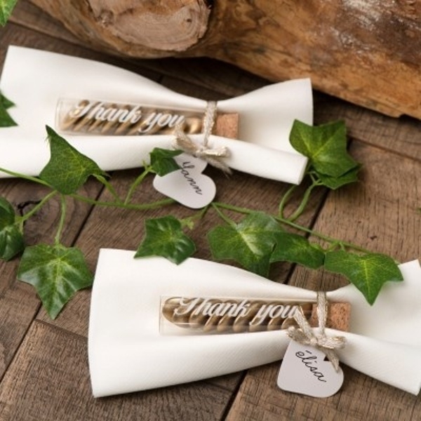 Výzdoba svatebního stolu v poslední době nabrala nový rozměr a to zahrnuje i přítomnost malých originálních skleněných zkumavek s korkovou zátkou s nápisem Thank you, naplněných malým druhem cukrovinek, například mandliček. Kreativita je stále stejně důležitá jako samotná svatební dekorace.