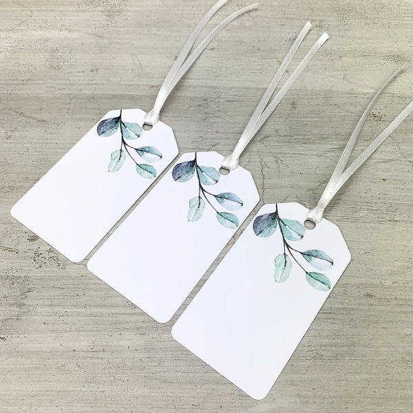Tvarované visačky bílé barvy se zelenými lístky bez potisku lze využít nejen na dárky, výslužky, různé pozornosti, ale také jako jmenovky na svatební tabuli jako označení pro hosty, kde mají sedět, nebo při rozlučkové party. Chcete být osobití? Tak na ni napiště svůj vzkaz. Visačka je s potiskem motivu je vyrobena z bílého papíru vyšší gramáže.